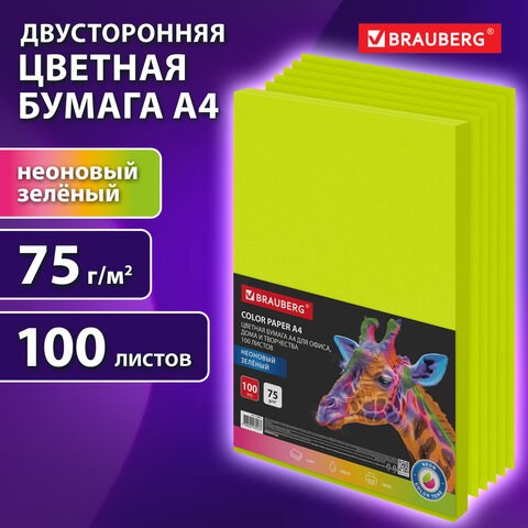 Бумага цветная BRAUBERG, А4, 75 г/м2, 100 л., НЕОН, зеленая, для офисной техники, 116671
