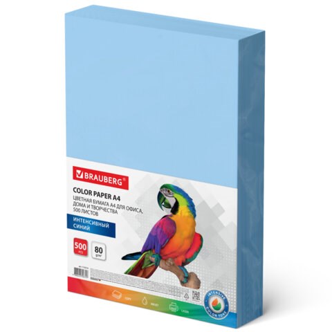 Бумага цветная BRAUBERG, А4, 80 г/м2, 500 л., интенсив, синяя, для офисной техники, 115214