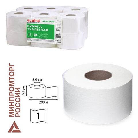 Бумага туалетная 200 м, LAIMA (T2), ADVANCED, 1-слойная, цвет белый, КОМПЛЕКТ 12 рулонов, 126093