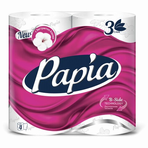 Бумага туалетная бытовая, спайка 4 шт., 3-слойная (4 х 16,8 м), PAPIA, белая, 5080720