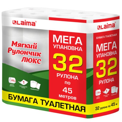 Бумага туалетная "МЯГКИЙ РУЛОНЧИК ЛЮКС" белая, 100% целлюлоза, спайка 32 рулона по 45 метров, 1-слойная, LAIMA, 114736