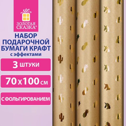 Бумага упаковочная подарочная крафт С ЭФФЕКТАМИ НАБОР 3 шт., "Trendy Kraft", 70х100 см, ЗОЛОТАЯ СКАЗКА, 591938