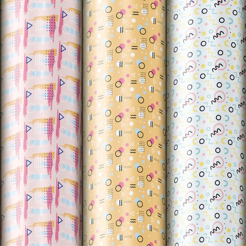 Бумага упаковочная мелованная НАБОР 3 шт., "Memphis", 70х100 см, 3 дизайна, ЗОЛОТАЯ СКАЗКА, 592067