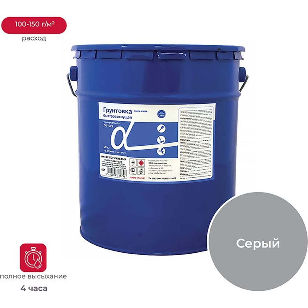 Предназначена для грунтования металлических и деревянных поверхностей под покрытие различными эмалями. Расход: 100-150 г/м², на однослойное покрытие в зависимости от цвета эмали. Высыхание: 4 часа. Срок годности: 1,5 года. Серый Грунт быстросохнущий по дереву и металлу ГФ-021 - грунтование металлических и деревянных поверхностей под покрытие различными эмалями; - отличные защитные свойства.