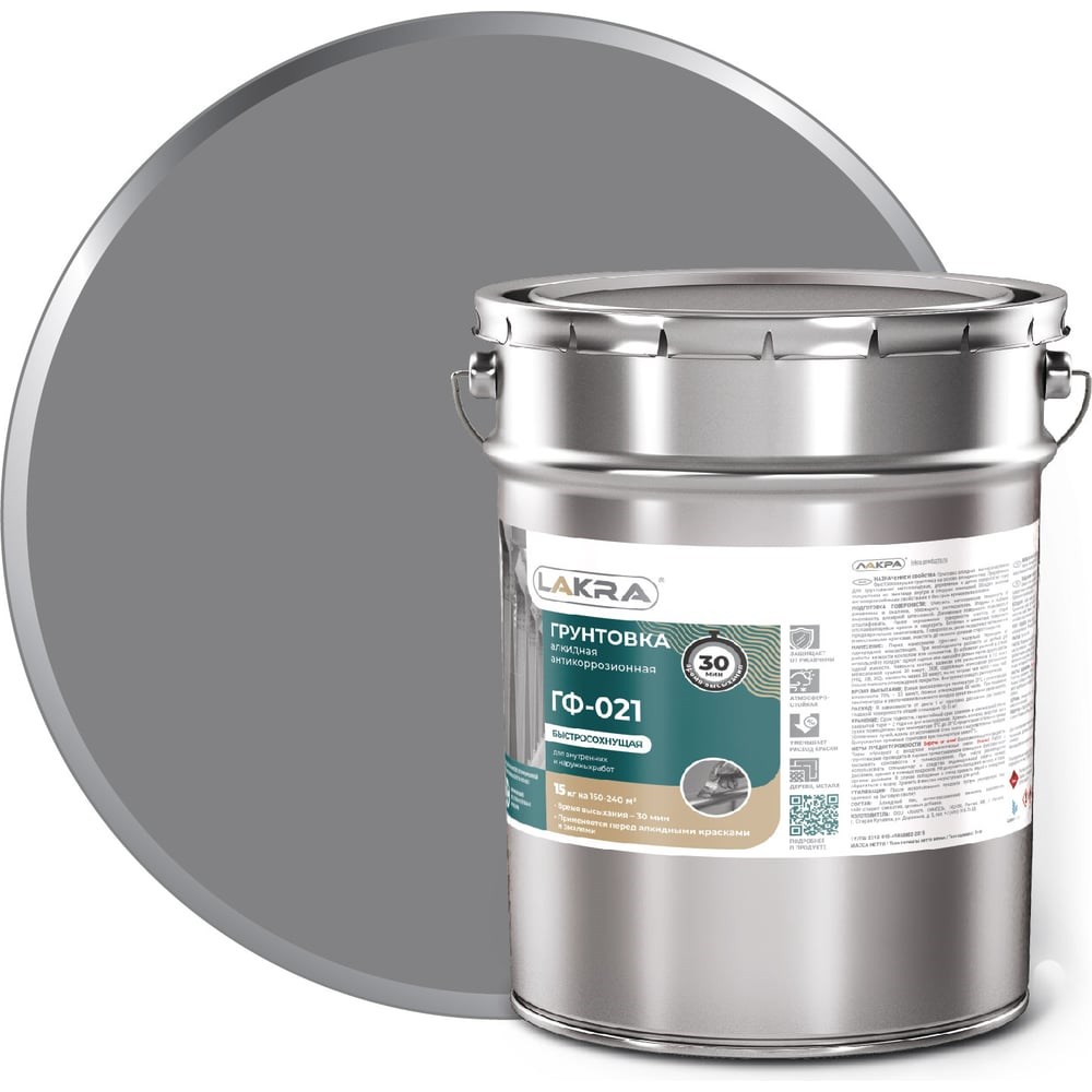 Грунт ЛАКРА ГФ-021 быстросохнущий, серый, 15 кг Лк-00012149 на основе алкидного лака, предназначен для грунтования металлических, деревянных и других поверхностей перед покрытием их различными эмалями внутри и снаружи помещений. Продукт обеспечивает прочное соединение лакокрасочных материалов с окрашиваемой поверхностью. Благодаря составу, грунт обладает высокими антикоррозийными свойствами. Способ применения: Перед нанесением тщательно перемешать до однородной массы. При необходимости состав разбавить уайт-спиритом, нефрасом, скипидаром или смесью указанных растворителей с сольвентом в соотношении 1:1. Предварительно поверхность очистить от пыли, ржавчины, окалины, жировых и других загрязнений. Наносить кистью, валиком или распылителем в 1-2 слоя. Дополнительные характеристики: Время высыхания при температуре +20°С и влажности воздуха 70%: 30 мин. Примерный расход: 10-16 кв. м/кг.