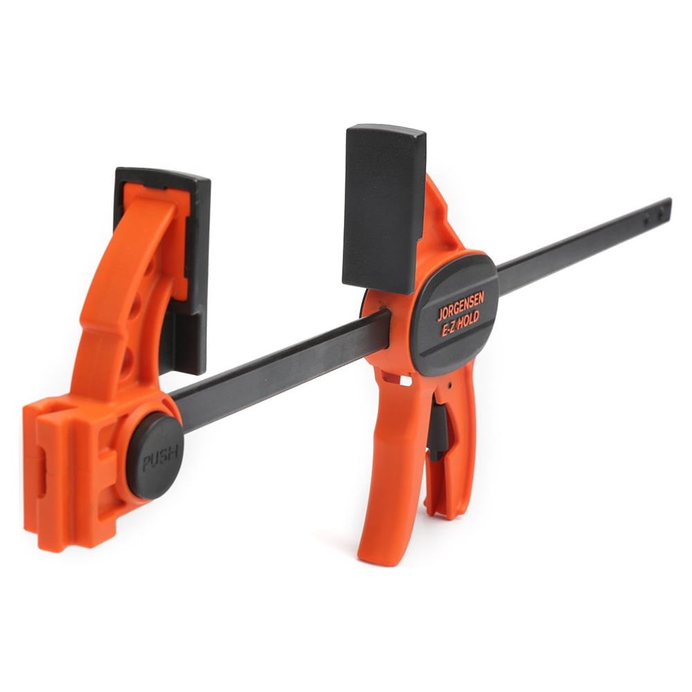 Струбцина идеально подходит для средних нагрузок в деревообработке, хобби, ремесленных и модельных проектах Самый популярный зажим E-Z HOLD Его также можно преобразовать в продольный зажим Особенности включают простой/удобный зажим одной рукой, раскрываемость губок с накладками до 660 мм при соединении двух струбцин, удобная контурная рукоятка и быстроразъемный рычаг