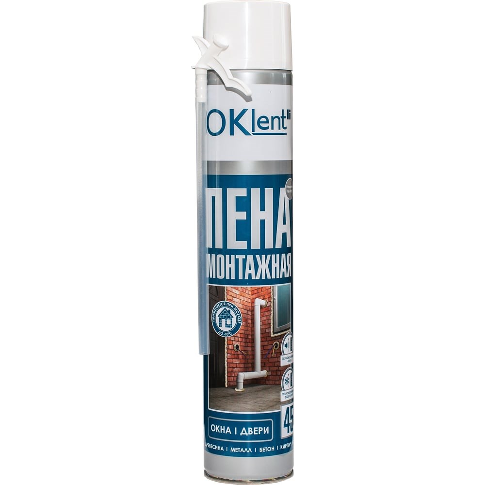 Монтажная пена OKlent 1000 мл, 680 гр, бытовая 00000340921 используется в качестве герметизации и звуко- теплоизоляции монтажных швов в кровельных и стеновых конструкциях. Имеет превосходную адгезию к большинству строительных материалов: древесина, гипсокартон, металл, кирпич, бетон, ПВХ, МДФ и т.п. Область применения: Монтаж оконных и балконных систем Установка дверных коробок Заполнение зазоров, трещин и проходных проемов коммуникаций