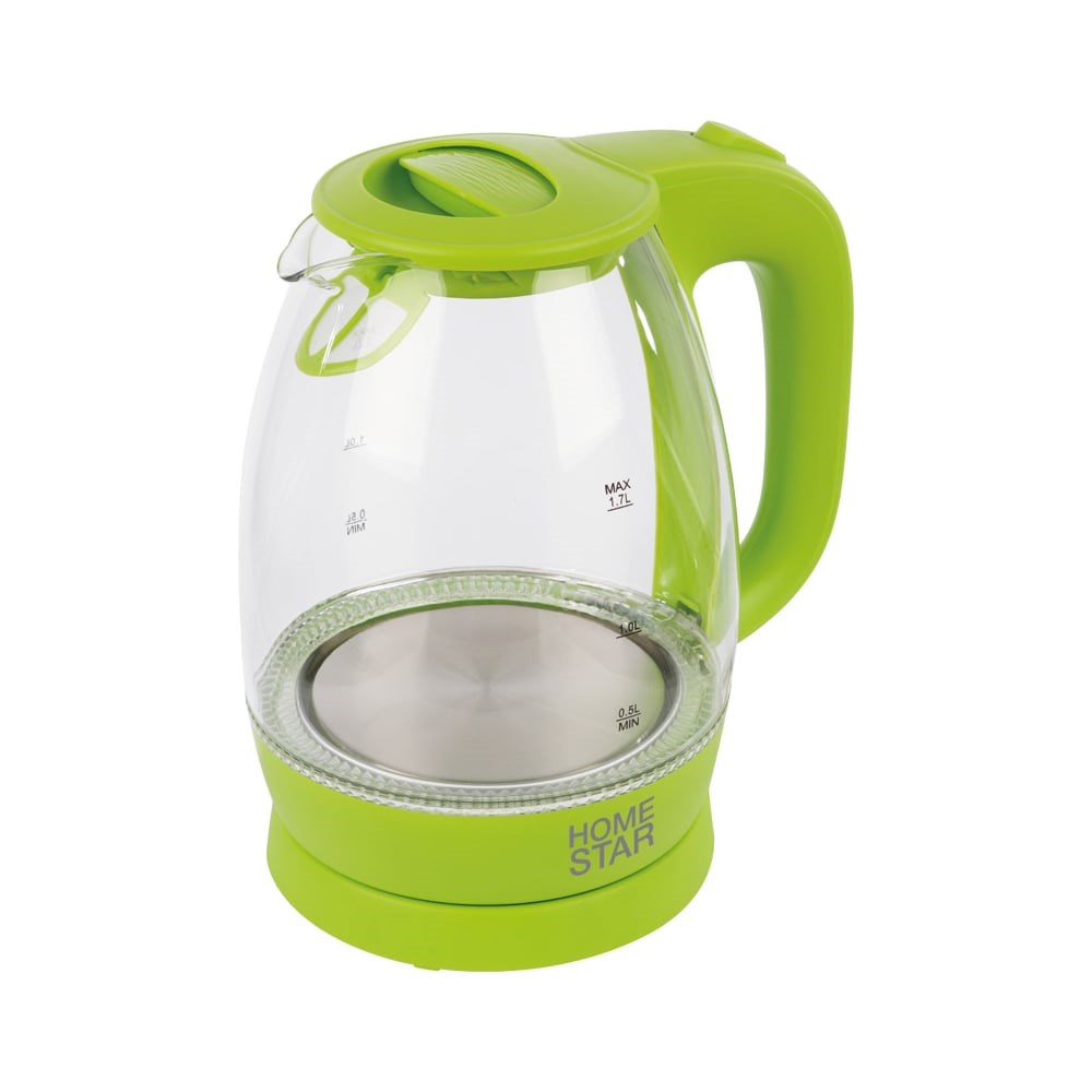 Чайник HomeStar HS-1012 1.7 л, стекло, пластик, зеленый 003943 оснащен функцией автоматического отключения при закипании. Корпус выполнен из термостойкого стекла, отличается прочностью и долговечностью. Модель оснащена внутренней подсветкой, которая придаст чайнику изящный вид. Он имеет закрый нагревательный элемент из нержавеющей стали, устойчивой к коррозии. Для комфортного использования предусмотрено специальное место для хранения шнура. Дополнительные характеристики Шкала уровня воды: есть Поворот на подставке 360° Мощность 1850-2200 Вт