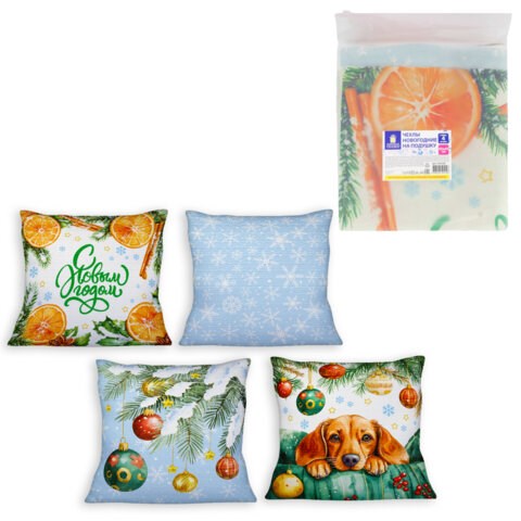 В набор входят чехлы, размером 45х45 см, что идеально подходит для стандартных декоративных подушек. Чехлы выполнены из полиэстера и украшены яркими новогодними мотивами: апельсины, елочные шары, милая собачка и, конечно же, снежинки.