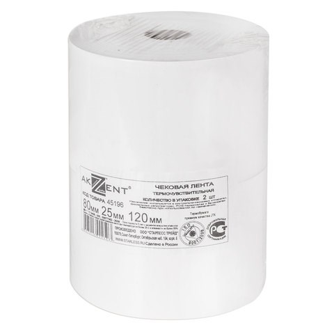 Чековая лента ТЕРМОБУМАГА 80 мм (диаметр 120 мм, длина 150 м, втулка 26 мм), слой наружу, КОМПЛЕКТ 2 шт., AKZENT, 52366