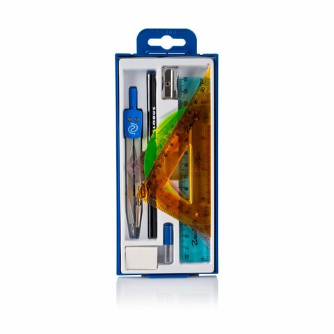 В наборе 9 предметов: циркуль литой, длина 125 мм, нержавеющий металл, синий цвет; пенал с запасным грифелем, линейка 15 см, треугольник 30°, треугольник 45°, транспортир, карандаш черно-графитный, точилка, ластик. Упаковка: пенал, европодвес.