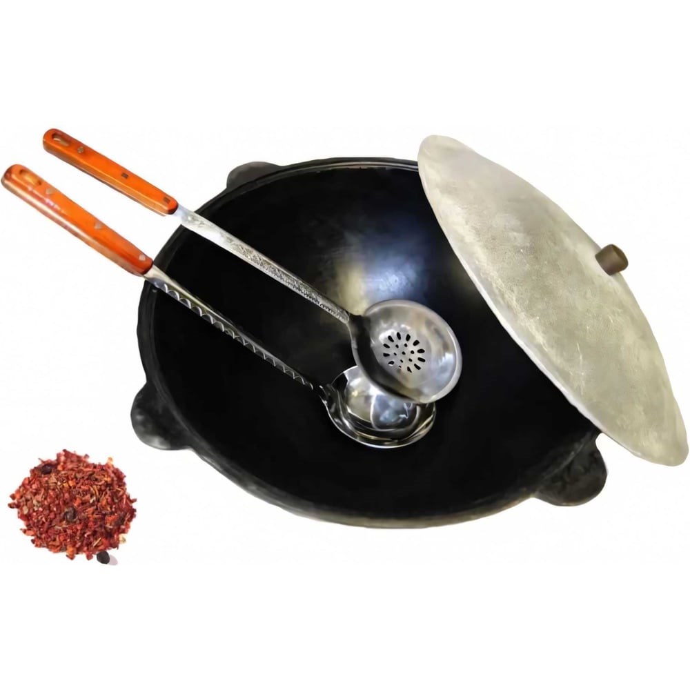 Чугунный казан Davr Metall Узбекский 10 л, плоское дно, с алюминиевой крышкой, с шумовкой, половником и специями КазУз10ЛПШПС идеально отшлифован и имеет гладкую внутреннюю поверхность. Толстостенный казан - толстые стенки и дно исключают пригорание, благодаря этому блюда будут томится в собственном соку, раскрывая все вкусы и сохраняя полезные вещества. В комплекте алюминиевая крышка, очень легкая, удобная в применении. Казан имеет 4 ручки-ушки, за которые его удобно переносить.