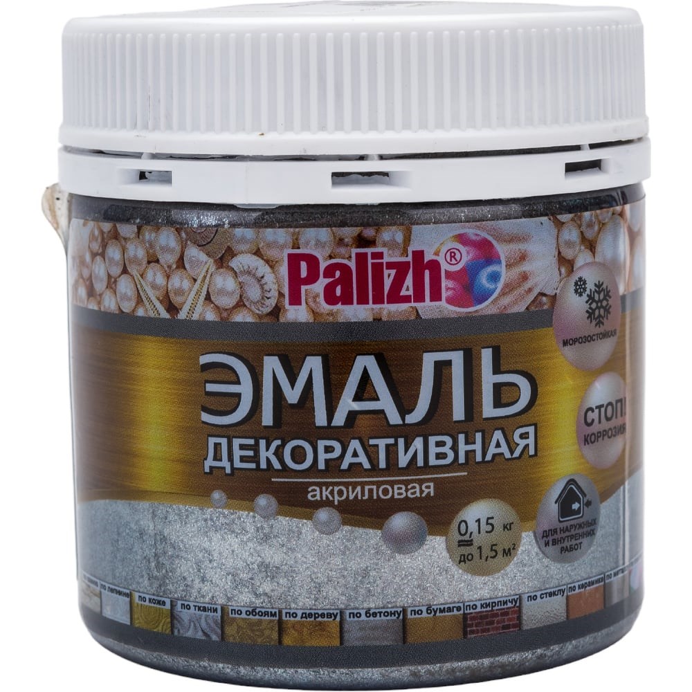 Акриловая эмаль PALIZH декоративная №90 темное серебро 0,15кг 11605626 предназначена для покраски и росписи поверхностей из дерева, обоев, бетона, гипсокартона, металла, в том числе кованных предметов. Средство может использоваться как снаружи, так и внутри помещений. Продукт препятствует возникновению мгновенной коррозии. Данное средство незаменимо при реставрационных работах. При желании возможно колерование акриловой эмали в различные цвета.