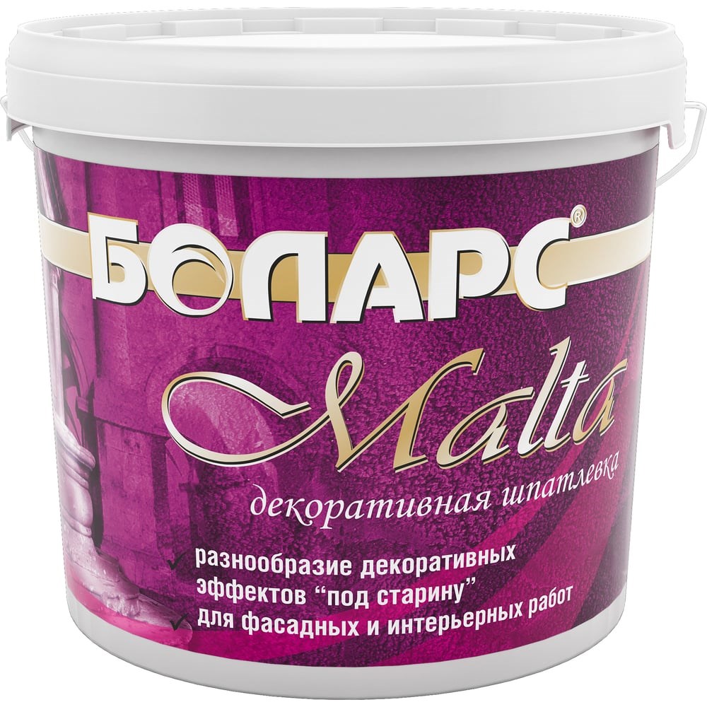 Декоративная акриловая шпатлевка БОЛАРС MALTA 200 15 кг 00000007469 предназначена для фасадных и внутренних работ. Изготовлена на основе минеральных природных наполнителей, армирующих волокон и водной дисперсии акрилового полимера. Эффектное решение для отделки "под старину", создающее впечатление состаренного натурального камня или застывших во времени морских волн. Не требует идеального выравнивания стен скрывает мелкие и средние дефекты, неровности. Работы производить при температуре воздуха и основания от +5 до +30 градусов. Эксплуатация покрытия в щадящем режиме возможна через 24 часа. Окончательная прочность покрытия достигается через 14 дней. Нанесение тонировочной краски на акриловой основе "Brilliance" или "Blush" возможно после полного высыхания декоративной шпатлевки через 24 часа.