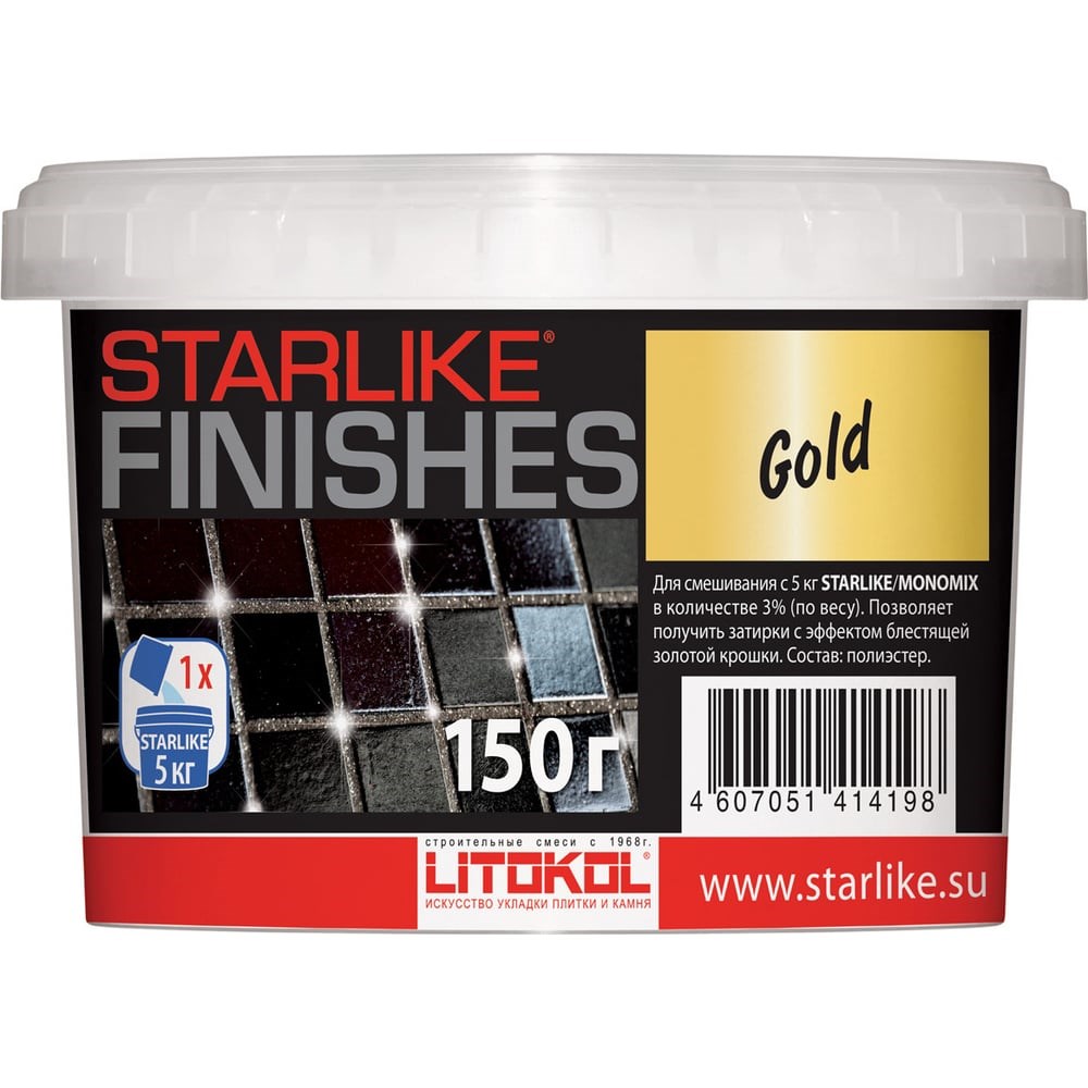 Декоративная добавка LITOKOL GOLD золотого цвета для Starlike 0,15 кг 478080004 служит для изменения внешнего вида межплиточных швов и получения новых оптических эффектов. Эффект будет более выраженными при направленном освещении. Подходит для профессионального использования. Состав применяется при затирке швов напольной и настенной внутренней облицовки из мозаики (стеклянной, керамической, металлической, деревянной), керамогранита, клинкера, натурального камня, агломерата, а также декорировании стен, в том числе: в ванных комнатах, кухнях, выставочных залах, магазинах, в элементах интерьера и т.д. Добавка предназначена для смешивания с любой цветной затиркой STARLIKE EVO для получения эффекта сверкающей золотой крошки на поверхности швов.