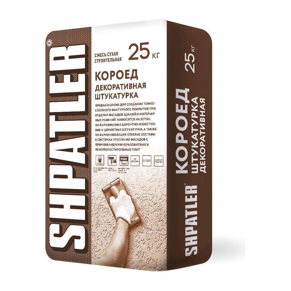 Декоративная штукатурка ШПАТЛЕР Короед 25 кг Ш00036 предназначена для создания тонкослойного фактурного покрытия при отделке фасадов зданий и интерьерных решений. Наносится на бетон, на выровненные цементно-известковые и цементные штукатурки, а также на выравнивающие клеевые составы в системах утепления фасадов с применением минераловатных и пенополистирольных плит. ГОСТ 31357-2007 Описание продукта: Сухая строительная штукатурная смесь на основе цементно- известкового вяжущего, включающая кварцевый наполнитель, мраморную крошку и добавки. Размер зерна крошки 2 мм. Возможна колеровка. Рекомендуется как для машинного, так и для ручного нанесения. После затвердевания образует прочный водостойкий и морозостойкий раствор. ТЕХНИЧЕСКИЕ ХАРАКТЕРИСТИКИ Температура применения +(5-30)°С Расход сухой смеси на 2 мм слоя 2-4 кг/м2 Расход воды при ручном нанесении 0,17-0,21 л/кг Наибольшая крупность зёрен заполнителя 2,0 мм Подвижность растворной смеси Пк3 Жизнеспособность готовой растворной смеси не менее 2 часа Марочная прочность М100 Марка по морозостойкости F100 Прочность сцепления с основанием через 28 суток 0,5 МПа Удельная эффективная активность естественных радионуклидов Аэфф не более 370 Бк/кг