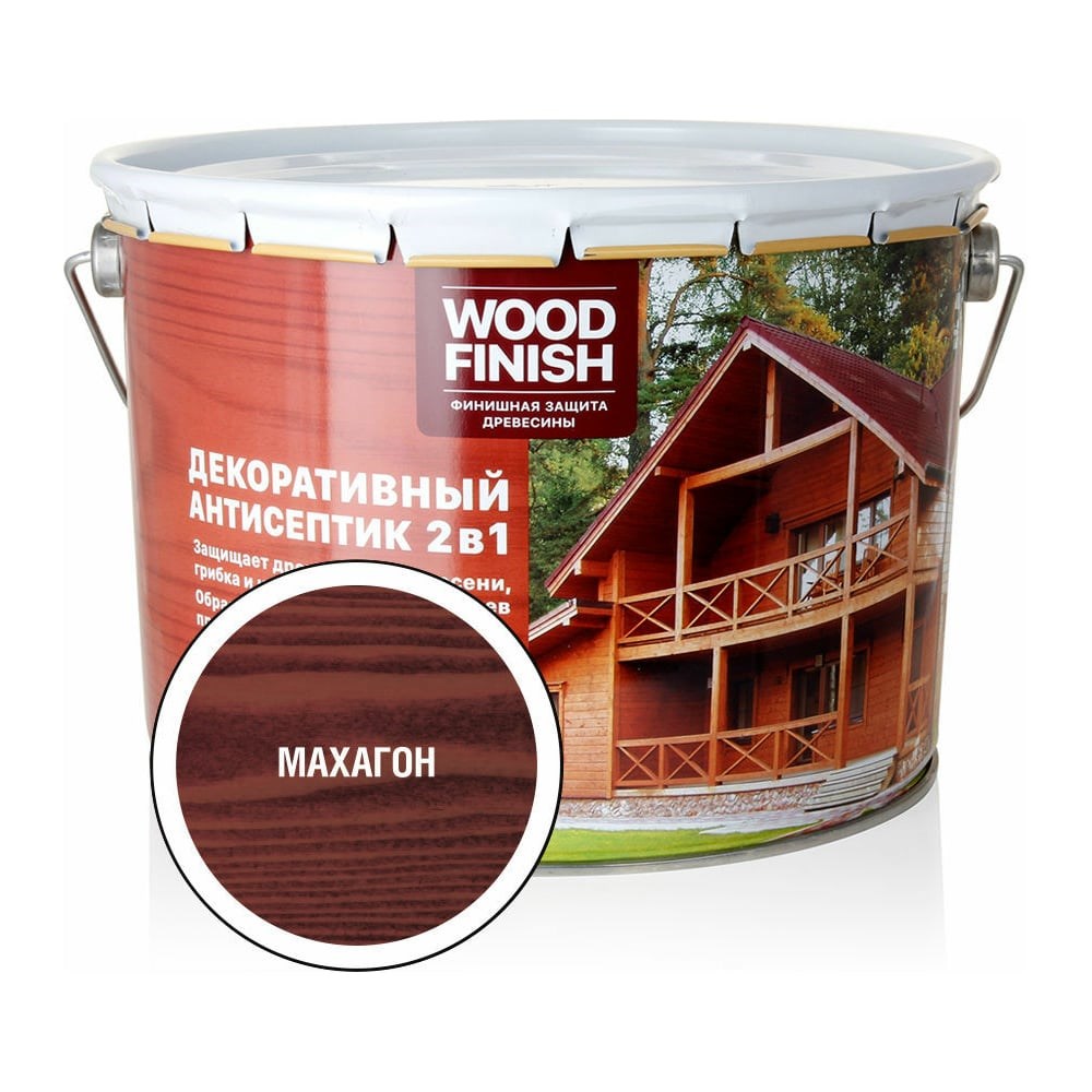 Декоративный антисептик ЗАО Декарт WOOD FINISH для дерева, махагон, 9 л 28483 предназначен для финишной отделки поверхности пиленой и строганой древесины снаружи и внутри помещений. Образует полуматовое покрытие. Обеспечивает защиту древесины до 5 лет. Расход Пиленая древесина: 1 литр на 5-8 кв.м. Строганая древесина: 1 литр на 10-13 кв.м. Точный расход зависит от свойств окрашиваемой поверхности и цвета антисептика. Подготовка поверхности Поверхность должна быть прочной, сухой, очищенной от смол и других загрязнений. Старые непрочные покрытия удалить. Способ нанесения Перед нанесением тщательно перемешать, допускается разбавление уайт-спиритом. Наносить кистью, валиком или краскопультом не менее, чем в 2 слоя. Рекомендуется предварительное грунтование бесцветным составом, разбавленным на 15-20% уайт-спиритом. Температура при проведении работ не должна опускаться ниже +5°С. При температуре +20°С и нормальной влажности воздуха время высыхания от пыли 3-4 часа. Следующий слой можно наносить через 24 часа. Сразу после работы инструменты очистить уайт-спиритом.