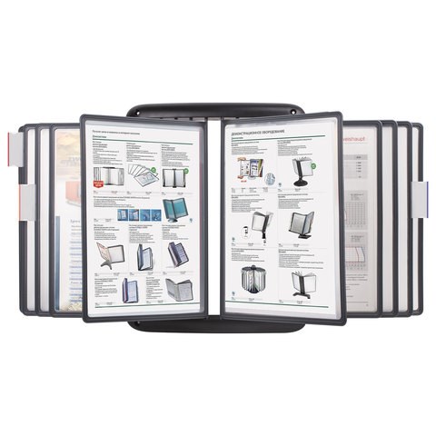 10 двухсторонних панелей позволяют разместить одновременно до 20 листов формата А4. Прочные и гибкие литые рамки панелей изготовлены из полипропилена, пригодного для повторной переработки и дальнейшего использования. Демопанели оснащены съемными ярлычками-табуляторами для маркировки и удобного поиска нужной информации. Карман демопанели из прочного прозрачного материала с антибликовым покрытием надежно защитит документы от внешних воздействий. Винты для крепления демосистемы к стене поставляются в комплекте.