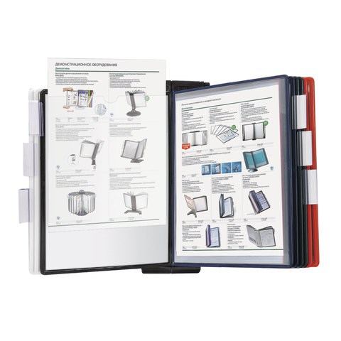10 двухсторонних цветных панелей позволяют разместить одновременно до 20 листов формата А4. Прочные и гибкие литые рамки панелей изготовлены из полипропилена, пригодного для повторной переработки и дальнейшего использования. Демопанели оснащены съемными ярлычками-табуляторами для маркировки и удобного поиска нужной информации. Карман демопанели из прочного прозрачного материала с антибликовым покрытием надежно защитит документы от внешних воздействий. Система удобна в обращении благодаря регулируемуму наклону разсположения панелей. Имеет устойчивое утяжеленное основание. Винты для крепления демосистемы к стене поставляются в комплекте. Стильный черный цвет пластикового корпуса подойдёт для большинства современных интерьеров.