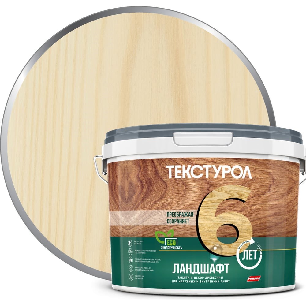 Деревозащитное средство на водной основе Текстурол Ландшафт ясень 9л Лк-00003722 используют внутри и снаружи помещений для финишной обработки фасадов и конструкций из ДВП, ДСП, фанеры и шпона (стеновые панели, оконные и дверные проемы, заборы и ограды). Продукт создает на поверхности дышащую шелковисто-матовую пленку с водо- и грязеотталкивающими свойствами, устойчивостью к ультрафиолету и атмосферному воздействию. Тиксотропный состав не разбрызгивается и не образует подтеков при вертикальном нанесении. Противогрибковые добавки препятствуют развитию микроорганизмов, гниению и дальнейшему разрушению древесины.