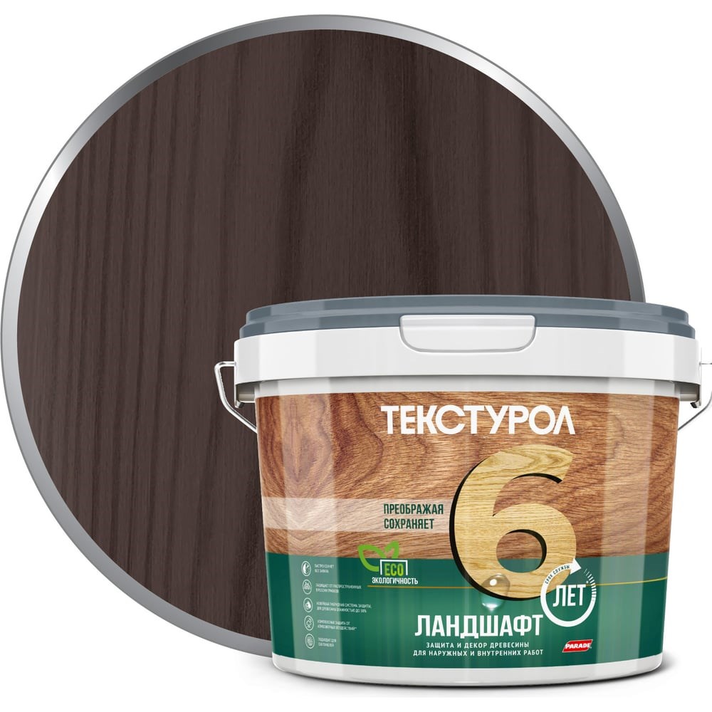 Деревозащитное средство на водной основе Текстурол Ландшафт палисандр 2,5л Лк-00003707 используют внутри и снаружи помещений для финишной обработки фасадов и конструкций из ДВП, ДСП, фанеры и шпона (стеновые панели, оконные и дверные проемы, заборы и ограды). Продукт создает на поверхности дышащую шелковисто-матовую пленку с водо- и грязеотталкивающими свойствами, устойчивостью к ультрафиолету и атмосферному воздействию. Тиксотропный состав не разбрызгивается и не образует подтеков при вертикальном нанесении. Противогрибковые добавки препятствуют развитию микроорганизмов, гниению и дальнейшему разрушению древесины.