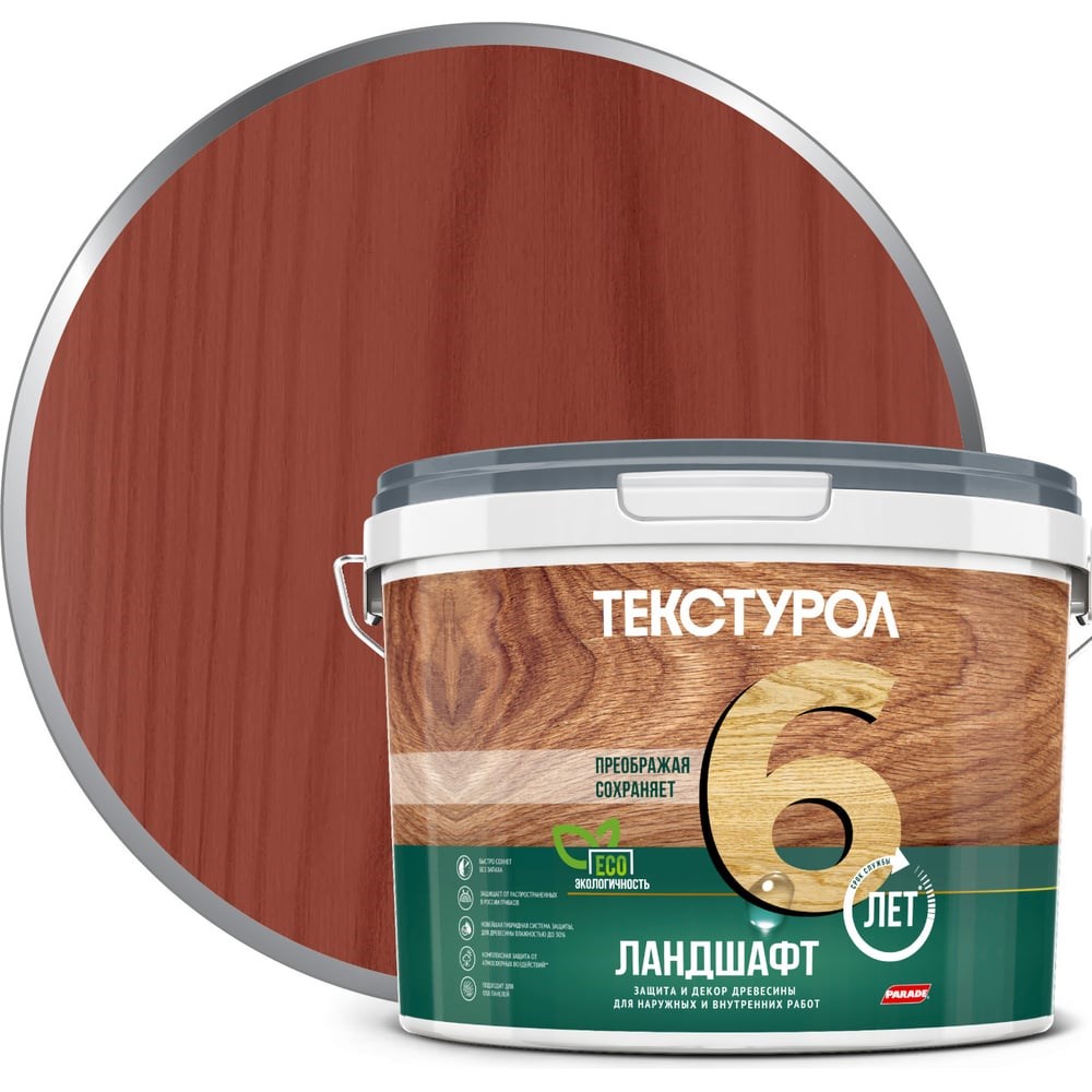 Деревозащитное средство на водной основе Текстурол Ландшафт рябина 9л Лк-00003701 используют внутри и снаружи помещений для финишной обработки фасадов и конструкций из ДВП, ДСП, фанеры и шпона (стеновые панели, оконные и дверные проемы, заборы и ограды). Продукт создает на поверхности дышащую шелковисто-матовую пленку с водо- и грязеотталкивающими свойствами, устойчивостью к ультрафиолету и атмосферному воздействию. Тиксотропный состав не разбрызгивается и не образует подтеков при вертикальном нанесении. Противогрибковые добавки препятствуют развитию микроорганизмов, гниению и дальнейшему разрушению древесины.