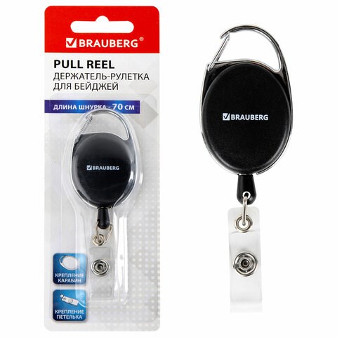 Держатель-рулетка для бейджей 70 см, петелька, карабин, черный, в блистере, BRAUBERG, 238237