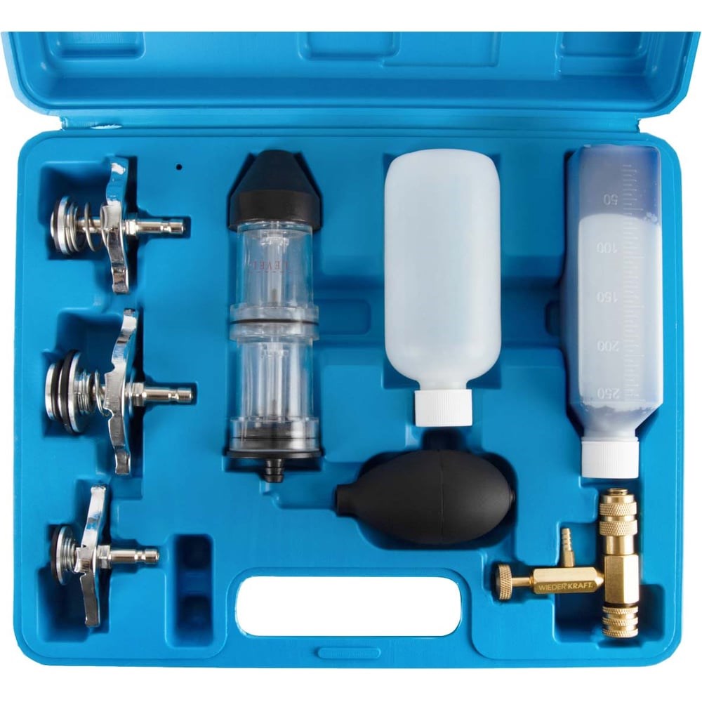 Тестер устанавливается в заливную горловину бачка охлаждающей жидкости. Отработавшие газы, попадая в систему охлаждения двигателя, накапливаются в «воздушной подушке» радиатора или расширительного бачка. Тестер анализирует состав смеси, тестовая жидкость меняет цвет с голубого на желтый, при наличии выхлопных газов в системе для бензиновых двигателей, и на зеленый, при наличии выхлопных газов в системе для дизельных двигателей. Обычный метод часто дает неправильный результат, так как присутствующие в воздухе частицы щелочи могут нейтрализовать эффект присутствия CO2, показывая что утечки нет, когда она присутствует. Эти частицы абсорбируются первой камерой тестера, которая действует как фильтр, позволяя только воздуху и CO2 достигать второй — верхней камеры. Если жидкость в верхней камере меняет цвет на желтый или зеленый, это факт свидетельствующий о наличии CO2 в антифризе и соответственно о прорыве выхлопных газов в систему охлаждения. Адаптеры: Mercedes-Benz, GM (buick), Jeep2) Peugeot, Subaru, Крайслер, Акура, GM (Нова, Спектрум и Спринт), Мицубиси, Ниссан, Мазда, Тойота, Инфинити, Гео, Сузуки, Исузу, Форд3) Хонда, Тойота, Сузуки, Мицубиси, Крайслер, Акура Для чего нужен второй пустой контейнер в комплекте? Отработанную реакционную жидкость необходимо слить в пустой контейнер и через некоторое время жидкость примет первоначальный цвет. Данный химический процесс органичен, поэтому при необходимости можно купить состав отдельно от набора.