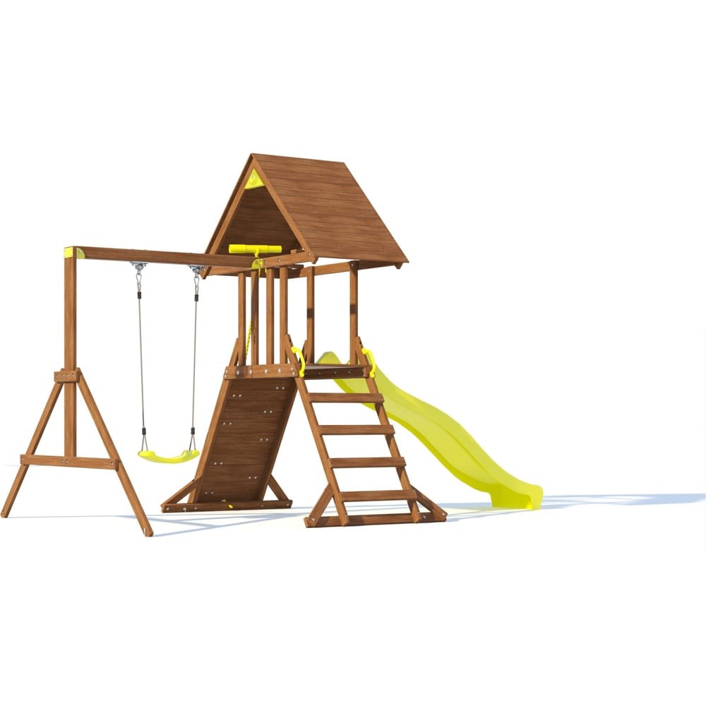 Детский игровой комплекс, детская площадка MoyDvor МойДвор Крепость свободы  10304 10 со скалодромом, горкой и качелями отлично подходит для организации детского досуга на свежем воздухе. Компактная и в то же время функциональная детская площадка позволит одновременно играть вместе целой группе детей. Благодаря продуманной конструкции игрового комплекса с широкой лестницей с поручнями, ограждению форта и деревянной крыше, защищающей от солнца и небольших осадков, малыши могут активно проводить время в полной безопасности. Детская площадка изготовлена из цельной древесины сосны, тщательно просушенной и обработанной пропиткой против гниения и насекомых. Дополнительные характеристики: Размер - 4100х2300х2650 мм Высота платформы форта - 1120 мм Размер платформы форта - 640х1350 мм Длина ската горки - 2200 мм. Внимание! Цвет горки в ассортименте: желтый, синий, красный.