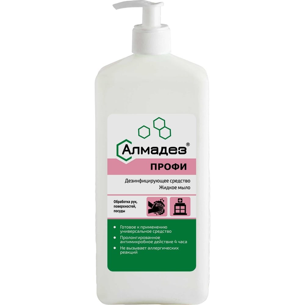 Дезинфицирующее мыло АЛМАДЕЗ Профи 1 л насос-дозатор МАП-85 производится в виде жидкого мыла, рН мыла 6,0±0,5. Антимикробная активность в отношении грамположительных и грамотрицательных бактерий (кроме микобактерий туберкулеза), возбудителей внутрибольничных инфекций (ВБИ); кишечных инфекций; грибов рода Кандида и Трихофитон. Обеспечивает длительную защиту от бактерий. Пролонгированный антимикробный эффект не менее 4 часов. Не сушит и не раздражает кожу рук даже при очень частом использовании, сохраняет эластичность. Не вызывает аллергических реакций. Подходит для частой повседневной обработки, так как содержит специальные добавки, смягчающие, увлажняющие и восстанавливающие кожу рук. Мытье и дезинфекция различных поверхностей и посуды. Обладает выраженными моющими и дезодорирующими свойствами. Моющая способность средства более 95%. Удаляет жировые и пигментирующие загрязнения (в том числе застарелые) на обрабатываемых поверхностях. Умывание рабочего раствора средства с обработанных поверхностей (кроме поверхностей, контактирующих с посудой, продуктами питания) после дезинфекции не требуется. Средство сохраняет свои свойства после замораживания и последующего оттаивания. Срок годности в невскрытой упаковке производителя: 6 лет.
