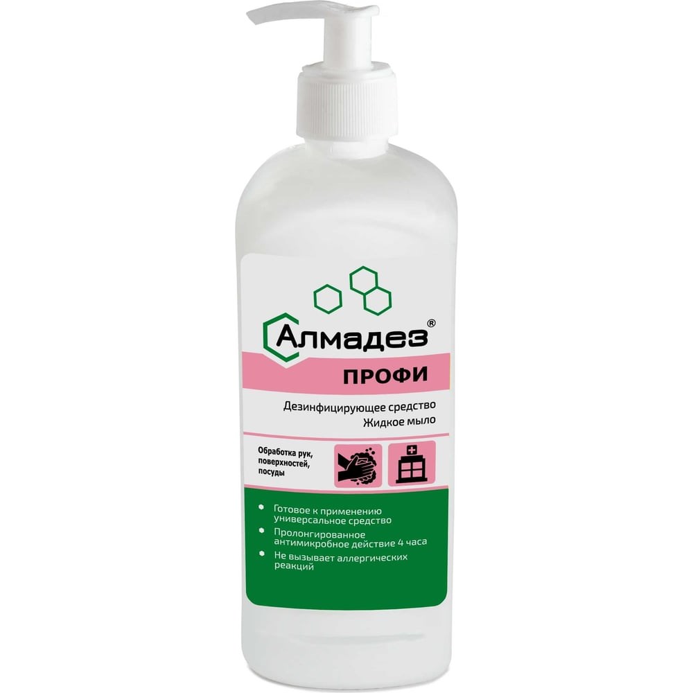 Дезинфицирующее средство АЛМАДЕЗ Профи мыло, 500 мл, насос-дозатор МАП-81 производится в виде жидкого мыла, рН мыла 6,0±0,5. Антимикробная активность в отношении грамположительных и грамотрицательных бактерий (кроме микобактерий туберкулеза), возбудителей внутрибольничных инфекций (ВБИ); кишечных инфекций; грибов рода Кандида и Трихофитон. Обеспечивает длительную защиту от бактерий. Пролонгированный антимикробный эффект не менее 4 часов. Не сушит и не раздражает кожу рук даже при очень частом использовании, сохраняет эластичность. Не вызывает аллергических реакций. Подходит для частой повседневной обработки, так как содержит специальные добавки, смягчающие, увлажняющие и восстанавливающие кожу рук. Мытье и дезинфекция различных поверхностей и посуды. Обладает выраженными моющими и дезодорирующими свойствами. Моющая способность средства более 95%. Удаляет жировые и пигментирующие загрязнения (в том числе застарелые) на обрабатываемых поверхностях. Умывание рабочего раствора средства с обработанных поверхностей (кроме поверхностей, контактирующих с посудой, продуктами питания) после дезинфекции не требуется. Средство сохраняет свои свойства после замораживания и последующего оттаивания. Срок годности в невскрытой упаковке производителя: 6 лет.