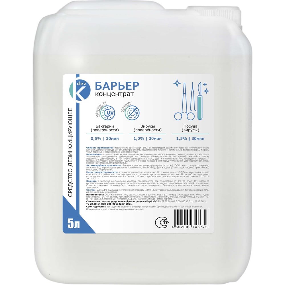 Дезинфицирующее средство ООО Континент Барьер 5 л 4602009724169 предназначено профилактической, текущей и заключительной дезинфекции поверхностей в помещениях, поверхностей аппаратов, приборов, жесткой мебели, предметов для мытья посуды, игрушек, спортивного инвентаря, средств личной гигиены, предметов ухода за больными, уборочного инвентаря и материала, резиновых и полипропиленовых ковриков, таможенных терминалах, коммунальных объектах. Отличается экономичным расходом, за счет чего средства хватит на долгий срок. Не содержит агрессивных ПАВ, благодаря чему безопасно для обрабатываемых поверхностей. Средство полностью разлагаемо, поэтому не вредит окружающей среде.