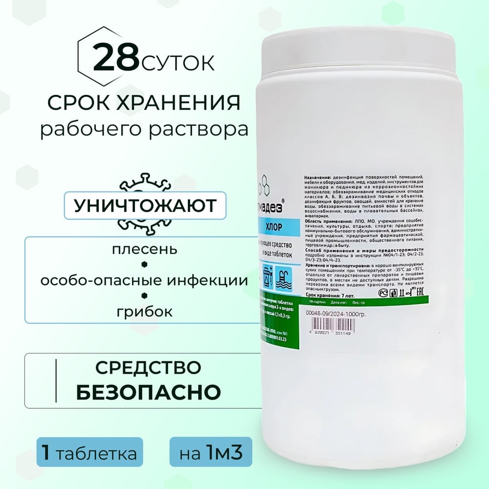Дезинфицирующие таблетки АЛМАДЕЗ Хлор 3,4 г, банка 1 кг АЛ-ХТ409 - высокоэффективное дезинфицирующее средство на основе натриевой соли дихлоризоциануровой кислоты. Алмадез хлор можно использовать для обеззараживания питьевой воды в системах хозяйственно-питьевого централизованного водоснабжения, индивидуальных и групповых запасов воды при децентрализованном водоснабжении, воды в плавательных бассейнах, аквапарках. АЛМАДЕЗ ХЛОР ЯВЛЯЕТСЯ ЕДИНСТВЕННЫМ СРЕДСТВОМ ДЛЯ ОБЕЗЗАРАЖИВАНИЯ ВОДЫ, ПРОВЕРЕННЫМ НА ОСОБО-ОПАСНЫЕ ИНФЕКЦИИ, ВКЛЮЧАЯ ХОЛЕРУ, ЧУМУ, ТУЛЯРЕМИЮ САП, МЕЛИОИДОЗ! ВЫСОКАЯ ЭФФЕКТИВНОСТЬ И ЭКОНОМИЧНОСТЬ! 1 таблетка 3,4 гр обеззараживает по всем бактериям, включая ООИ ( холеру и др.), вирусам, грибам: 750 литров воды системах хозяйственно-питьевого централизованного водоснабжения, водопроводной, родниковой, колодезной чистой, артезианской 375 литров воды колодезной из незащищённых колодцев, речной, озёрной (малозагрязнённой) 250 литров воды речной, прудовой, содержащей органические загрязнения
