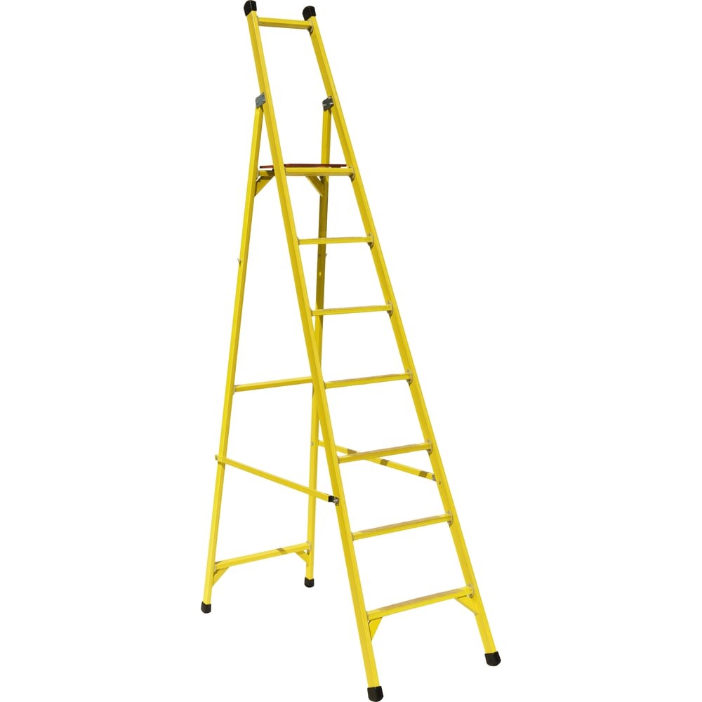 Стремянка диэлектрическая стеклопластиковая с симметричной опорой ЛУЧ изготавливается из электроизоляционного стеклопластика и предназначена для проведения строительных, монтажных, ремонтных и эксплуатационных работ. Рабочая площадка имеет фиксатор из нержавеющей стали. Ступени покрыты противоскользящими рёбрами, для предотвращения соскальзывания обуви.
