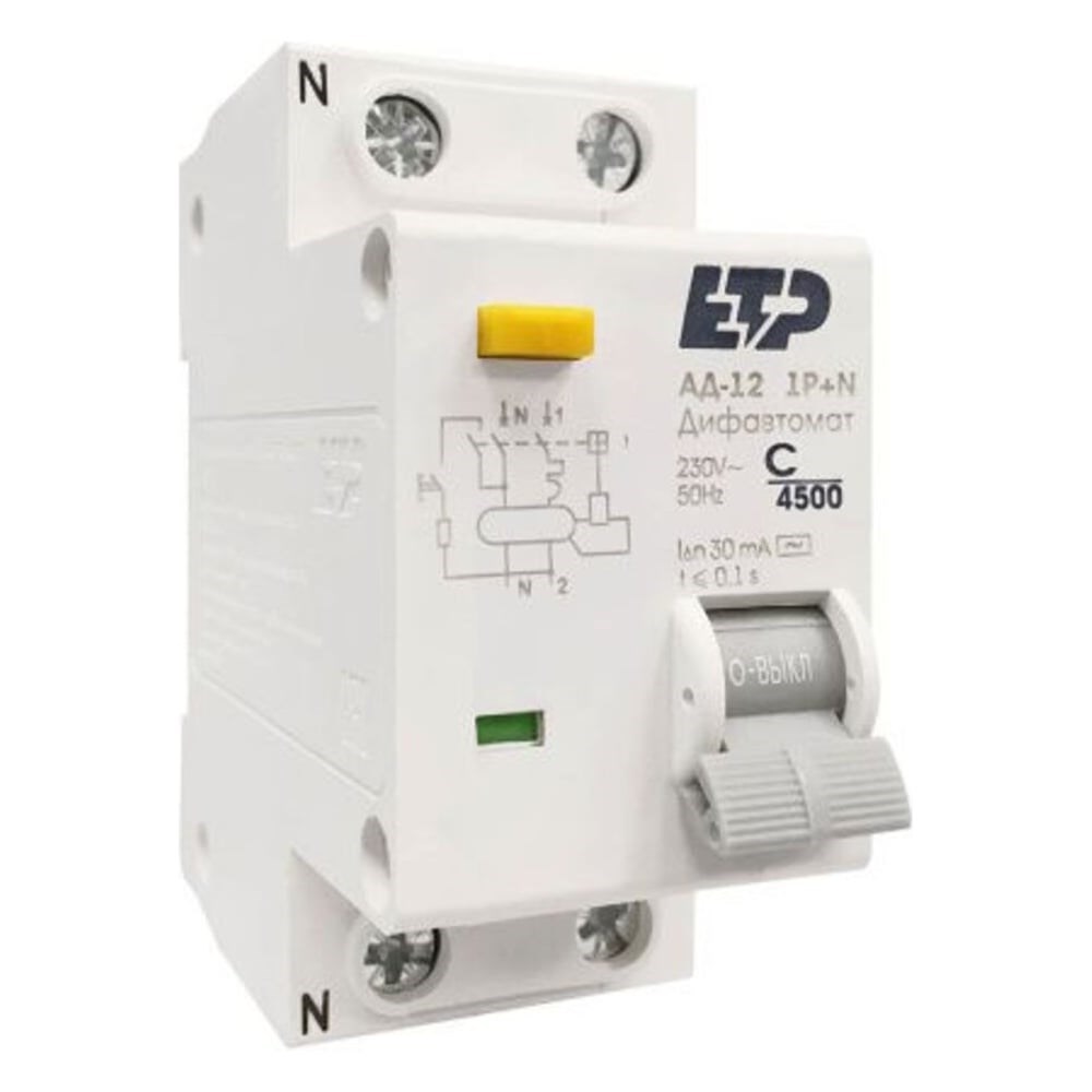 Дифференциальный автомат ETP 1P+N 40А тип АС 30 мА 4,5 кА 19016 представляет собой аппарат, сочетающий функции автоматического выключателя с устройством защитного отключения. При обнаружении автоматическим выключателем в защищаемом участке сети тока утечки (повреждения) на землю или сверхтока (тока перегрузки или короткого замыкания) происходит срабатывание устройства, приводящее к отключению защищаемой сети. Таким образом, дифференциальный автоматический выключатель серии АД-12 применяется для: Проведения тока в нормальном режиме. Отключения тока при коротких замыканиях или перегрузке. Отключения тока при прикосновении человека к токоведущим частям электроустановок или протекании дифференциального (утечки) тока на землю. Защиты электрооборудования (ЭО) при повреждении изоляции проводников и неисправностях ЭО. Предотвращения возгораний и пожаров, возникающих вследствие протекания токов утечки и развивающихся из них коротких замыканий, замыканий на корпус и замыканий на землю.