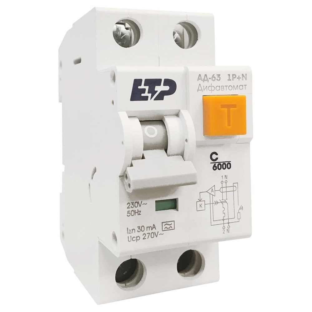 Дифференциальный автомат ETP 1P+N 10А тип A 30 мА 6 кА 19052 представляет собой аппарат, сочетающий функции автоматического выключателя с устройством защитного отключения. При обнаружении автоматическим выключателем в защищаемом участке сети тока утечки (повреждения) на землю или сверхтока (тока перегрузки или короткого замыкания) происходит срабатывание устройства, приводящее к отключению защищаемой сети. Таким образом, дифференциальный автоматический выключатель серии АД-12 ETP применяется для: Проведения тока в нормальном режиме. Отключения тока при коротких замыканиях или перегрузке. Отключения тока при прикосновении человека к токоведущим частям электроустановок или протекании дифференциального (утечки) тока на землю. Для защиты электрооборудования (ЭО) при повреждении изоляции проводников и неисправностях ЭО. Для предотвращения возгораний и пожаров, возникающих вследствие протекания токов утечки и развивающихся из них коротких замыканий, замыканий на корпус и замыканий на землю.
