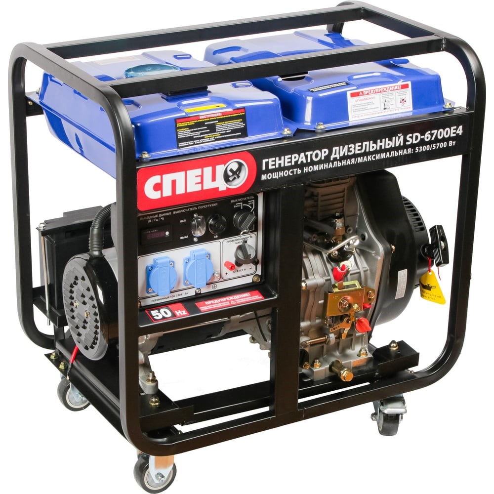 Дизельный генератор СПЕЦ SD-6700E4 1фаз,ном/макс=5,3/5,7кВт с электростар.,аккум.,колёса-4шт 3467 СПЕЦ-3467 удобен и безопасен в использовании. Не требует особого обслуживания, легко чистить и проводить диагностику. Преимущества:электрический стартер,медная обмотка статора и ротора,надежный и экономичный двигатель,низкие эксплуатационные расходы,гарантированный запуск в зимнее время,автоматический контроль уровня и давления масла.дисплейразъем для АВР