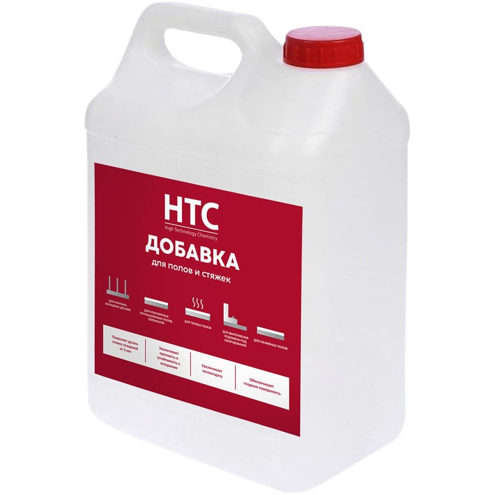 Добавка для полов и стяжек НТС- специализированный высокоэффективный пластификатор, повышающий прочность и подвижность бетонов и растворов при устройстве монолитных бетонных полов и стяжек. Выполнение тонких стяжек толщиной от 3 мм. Смесь приобретает гомогенную и плотную структуру. Процесс выравнивания пола осуществляется легче и поверхность бетона получается гладкой. Придает смеси свойство самовыравнивания. Основное действие – повышает растворимость цементного клинкера, взаимодействует с частицами цемента – «расталкивает» и, тем самым, пластифицирует смесь, снижает количество воды, уменьшает количество воздушных пор уплотняя смесь, образует комплексные соединения с минералами цемента вследствие чего повышает прочность и ускоряет твердение, образует на частицах водонепроницаемый слой повышая сопротивление к агрессивным средам. Области применения: Для устройства теплых полов с любым типом нагревательных элементов Для устройства стяжки, в т.ч. тонких стяжек толщиной от 3 мм Для устройства монолитных промышленных полов, наливные полы Для устройства монолитных плит перекрытий В дорожном строительстве (мосты, тоннели, путепроводы и т.п.) Для выполнения подливок под оборудование Для монтажа закладных деталей фонарей и мачт освещения Ремонтные растворы для горизонтальных поверхностей Бетоны на пористых заполнителях Для наружных и внутренних работ Для промышленного и гражданского строительства Во всех климатических районах