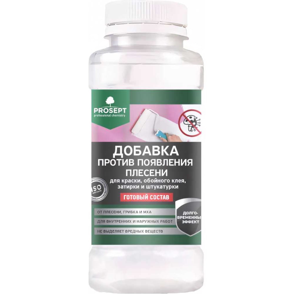 Добавка против появления плесени в краску, шпатлевку, штукатурку PROSEPT FUNGI STOP 0,25 л 041-025 эффективно работает в комплексе с материалами на водной основе: растворами, шпатлевками, дисперсионными красками, затирками, обойным клеем, штукатурками. Для внутренних и наружных работ. Отлично санирует поверхности стен, кирпичной кладки, потолков, межпанельных швов. Обладает долговременным эффектом. Подходит для использования в жилых помещениях, ванных комнатах, погребах, овощехранилищах, складских помещениях, на фасадах зданий, памятниках и т. д Способ применения Водорастворимая краска: добавить 1 флакон средства объемом 250 мл на 10 л краски и тщательно перемешать. Строительные растворы: 250 мл средства хватает для 10 л воды. Шпатлевка или штукатурка замешиваются на полученном растворе. Затирка для швов: 100 мл добавляется в воду для затворения на 5 кг сухой массы. Обойный клей: в жидкость для замешивания клея добавить примерно 30 - 50 мл активного средства на 1 л воды, после чего согласно инструкции приготовить клей.
