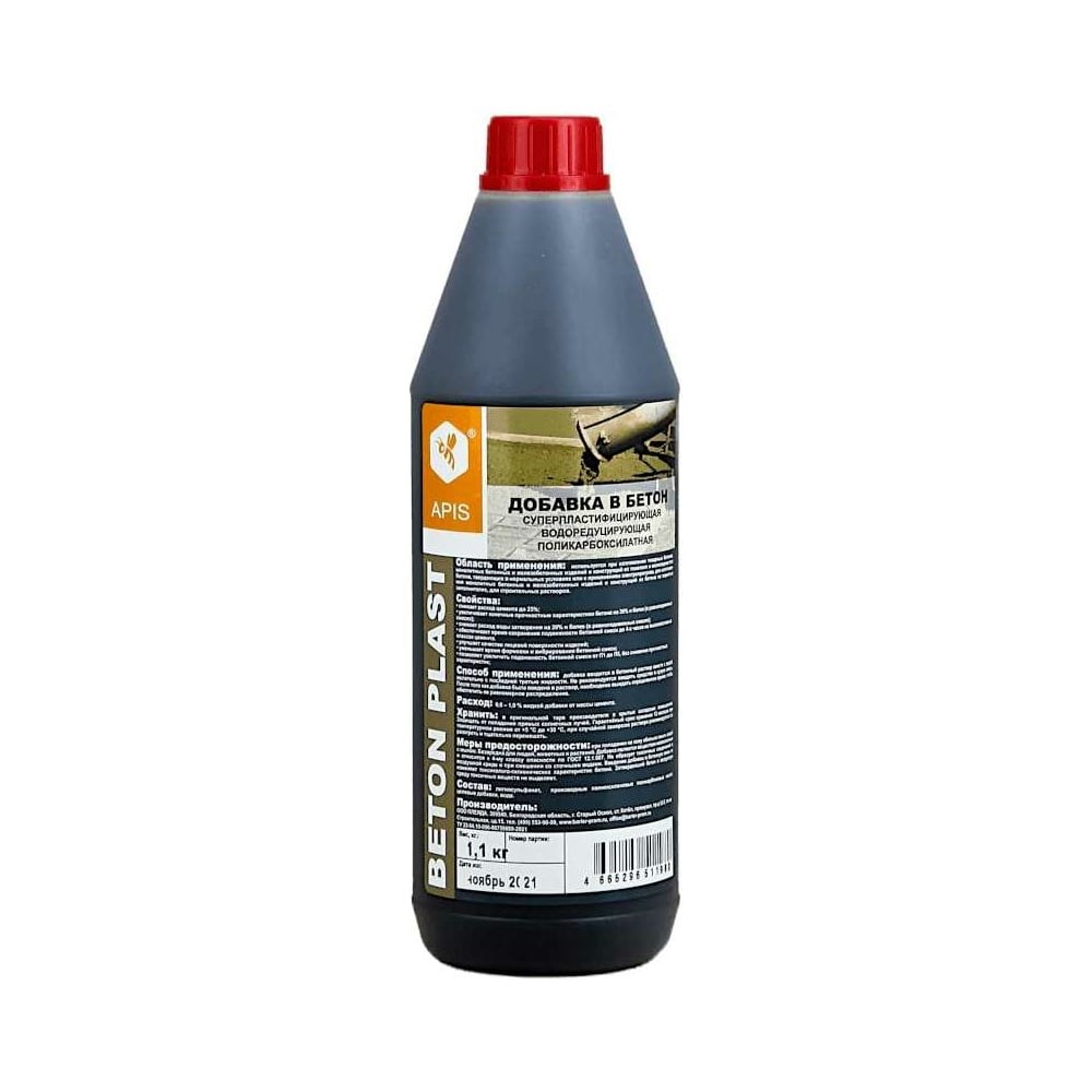 Добавка в бетонные растворы APIS BETON PLAST (бутылка; 1,1 кг) 4665296517241 используется при изготовлении товарных бетонов, монолитных бетонных и железобетонных изделий и конструкций из тяжелого и мелкозернистого бетона, твердеющих в нормальных условиях или с применением электропрогрева.