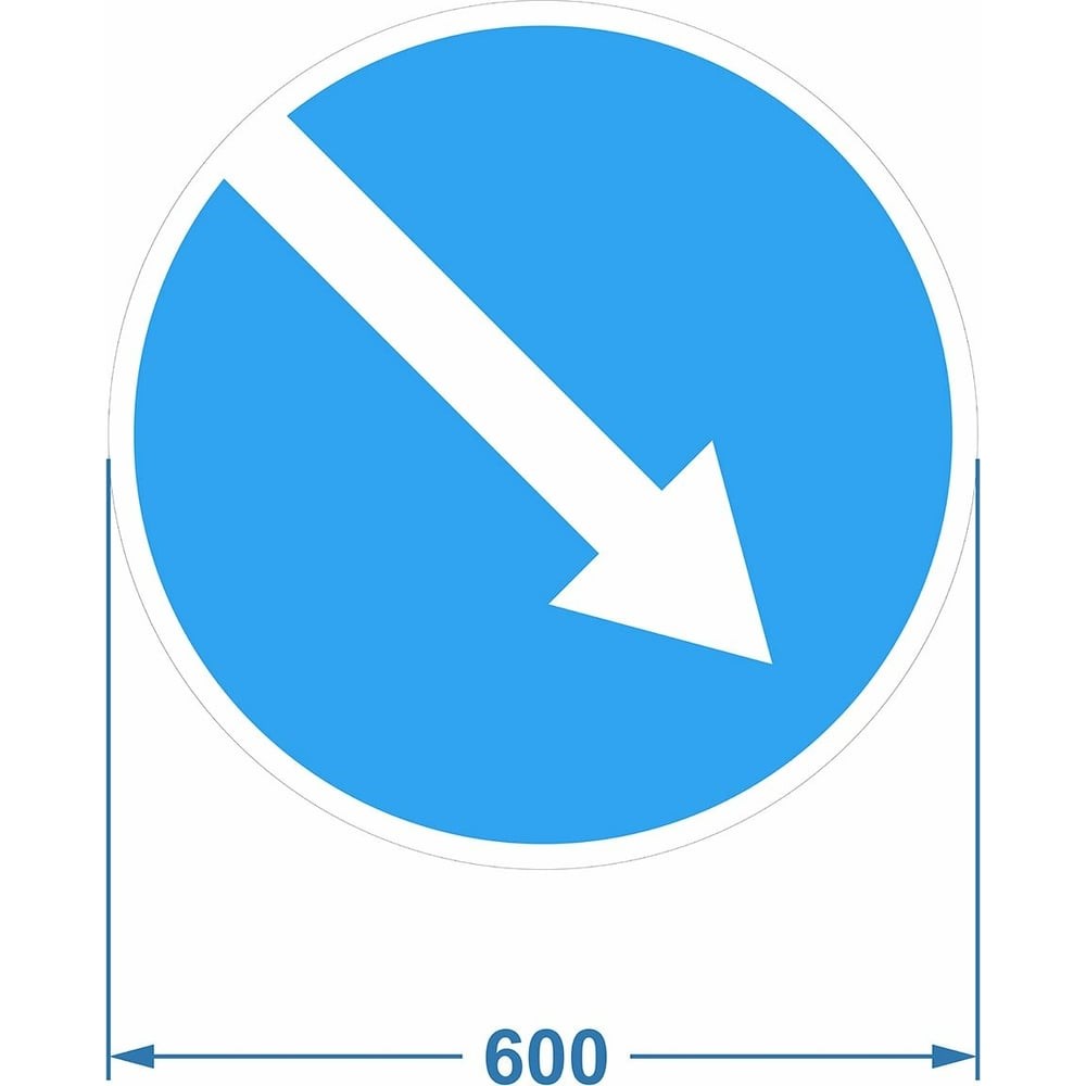 Дорожный знак 4.2.1 "Объезд препятствия справа" PALITRA TECHNOLOGY 120006-4-2-1-I предписывает водителям транспортных средств и пешеходам объезжать (обходить) препятствие справа. С целью длительной эксплуатации и в соответствии с ГОСТ Р 52289-2004 и ГОСТ Р 52290-2004, дорожные знаки, в качестве подложки, изготавливаются из оцинкованной стали толщиной 1 мм, с последующей поклейкой световозвращающей плёнкой. Габаритные размеры знака - 600 мм по ширине, 600 мм в высоту. Плёнка световозвращающая - инженерная.