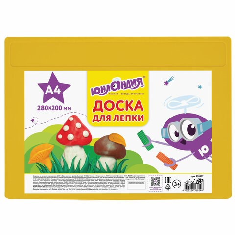 Производится из жесткого прочного пластика толщиной 3 мм, к которому не липнет пластилин. Гладкая фактура материала устойчива к царапинам. Размер - 280х200 мм (формат А4). Цвет: желтый.