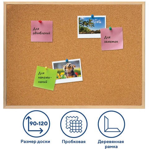 Поверхность изготовлена из натуральной пробки. Имеет деревянную рамку. Размер доски - 90х120 см. Цвет покрытия: коричневый. Возможность горизонтального и вертикального размещения доски. Крепится к стене, элементы крепления входят в комплект. Гарантия 10 лет. Отверстия в пробке "закрываются" сразу же после извлечения кнопки. Таким образом, доска прослужит на протяжении долгих лет, несмотря на частое использование.