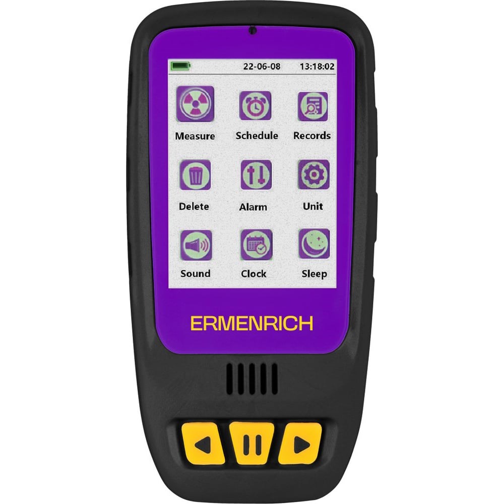 Дозиметр Ermenrich Ping RD40 измеряет гамма-, бета- и рентгеновское излучение в окружающей среде – воздухе, воде, продуктах питания, предметах обихода. Счетчик Гейгера-Мюллера считывает уровень излучения в диапазоне от 0,08 мкЗв до 50 мЗв меньше, чем за 10 секунд, а в случае опасно повышенной дозы – подает звуковой или световой сигнал.Работает дозиметр от литиевого аккумулятора, заряда которого хватает на 14 дней непрерывной работы, так что прибор можно использовать постоянно. Индикатор уровня заряда подскажет, когда следует зарядить батарею.Все данные выводятся на цветной ЖК-экран, где одновременно отображаются текущая, средняя и суммарная доза, а также время, дата и уровень заряда батареи. В памяти устройства можно сохранить до 10 предыдущих измерений. Компактный корпус с эргономично расположенными кнопками удобно ложится в ладонь и легко управляется одной рукой.