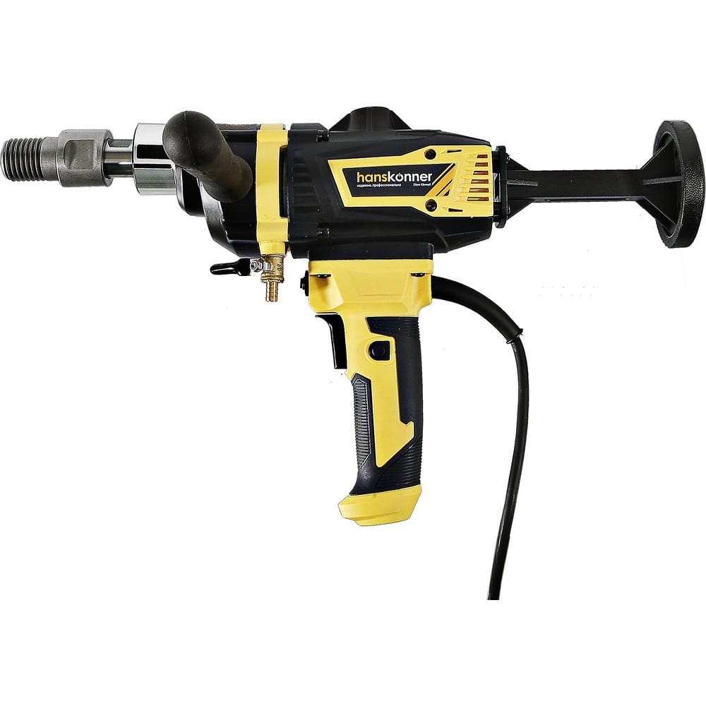 Дрель алмазного сверления Hanskonner HID2180M — компактный и мощный электроинструмент с надежной конструкцией для сверления алмазными коронками отверстий в таких материалах: бетон, железобетон, искусственный и натуральный камень, кирпич. Подключив инструмент к водопроводному крану можно сократить запыленность рабочей зоны, а также износ алмазных коронок и дрели. Данная модель оснащена предохранительной муфтой, срабатывающей при заклинивании коронки, и термозащитой работающей при других видах перегруженности. Применение в конструкции фирменных японских подшипников NSK повышенного ресурса способствует исправной и долговечной эксплуатации электроинструмента. Удобству в практическом обращении с дрелью содействует адаптер под алмазные коронки с хвостовиком 1 1/4", идущий в комплекте, фиксатор-липучка расположенный на кабеле и блокировка выключателя во включенном положении при длительных работах. Регулировка частоты вращения осуществляется усилием, приложенным к кнопке включения. Морозостойкий резиновый сетевой кабель длинной 4 м, позволяет охватит рабочую зону площадью 50 м2.