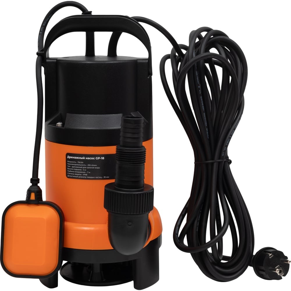 Дренажный насос для грязной воды Gigant GP-18 используется для перекачки загрязненной воды из естественных водоемов, оросительных каналов и дренажных колодцев, затопленных жилых помещений и подвалов. Допустимый размер пропускаемых механических частиц - до 35 мм. Использование в воде с более крупными включениями изнашивает рабочие части насоса и может привести к заклиниванию рабочего колеса. Дренажный насос оснащен поплавковым выключателем для предотвращения работы «всухую». Длина кабеля поплавка настраивается в зависимости от дебита водоема, чтобы двигатель отключался при достижении минимального или максимального уровня воды. В модели нижний забор воды, это необходимо учесть при установке уровня выключения насоса. Количество срабатываний не должно превышать 20 в час. Корпус насоса выполнен из пластика, сверху имеется удобная ручка для транспортировки и крепления троса. Насос способен создавать напор в 5 м и перекачивать до 255 л/мин. Выходная магистраль имеет диаметр 1,5 дюйма.