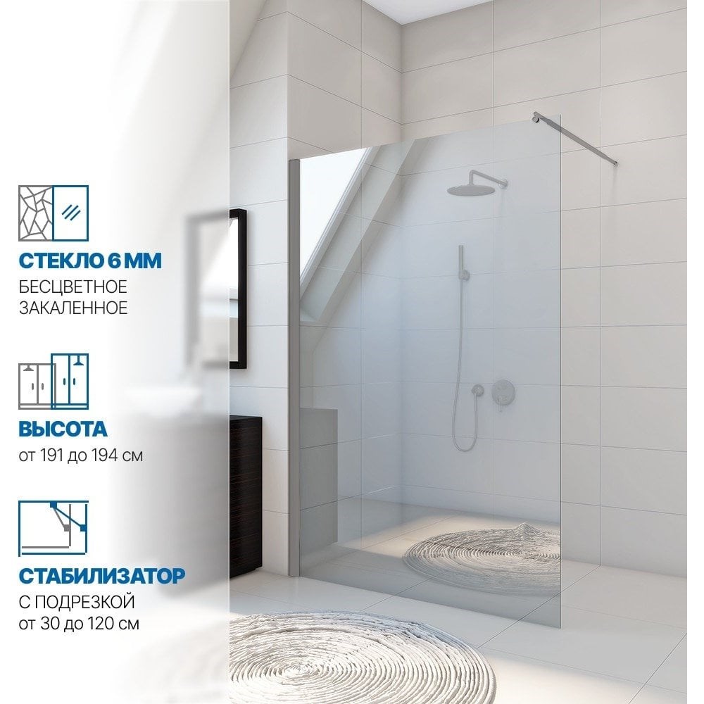 Душевая перегородка неподвижная с поперечным стабилизатором производства фабрики GuteWetter.Душевая перегородка экономное решение для душевого ограждения. В комплекте применяется стенный набор регулируемых профилей.Внимание! Душевая перегородка универсальная. Возможен левый и правый монтаж.