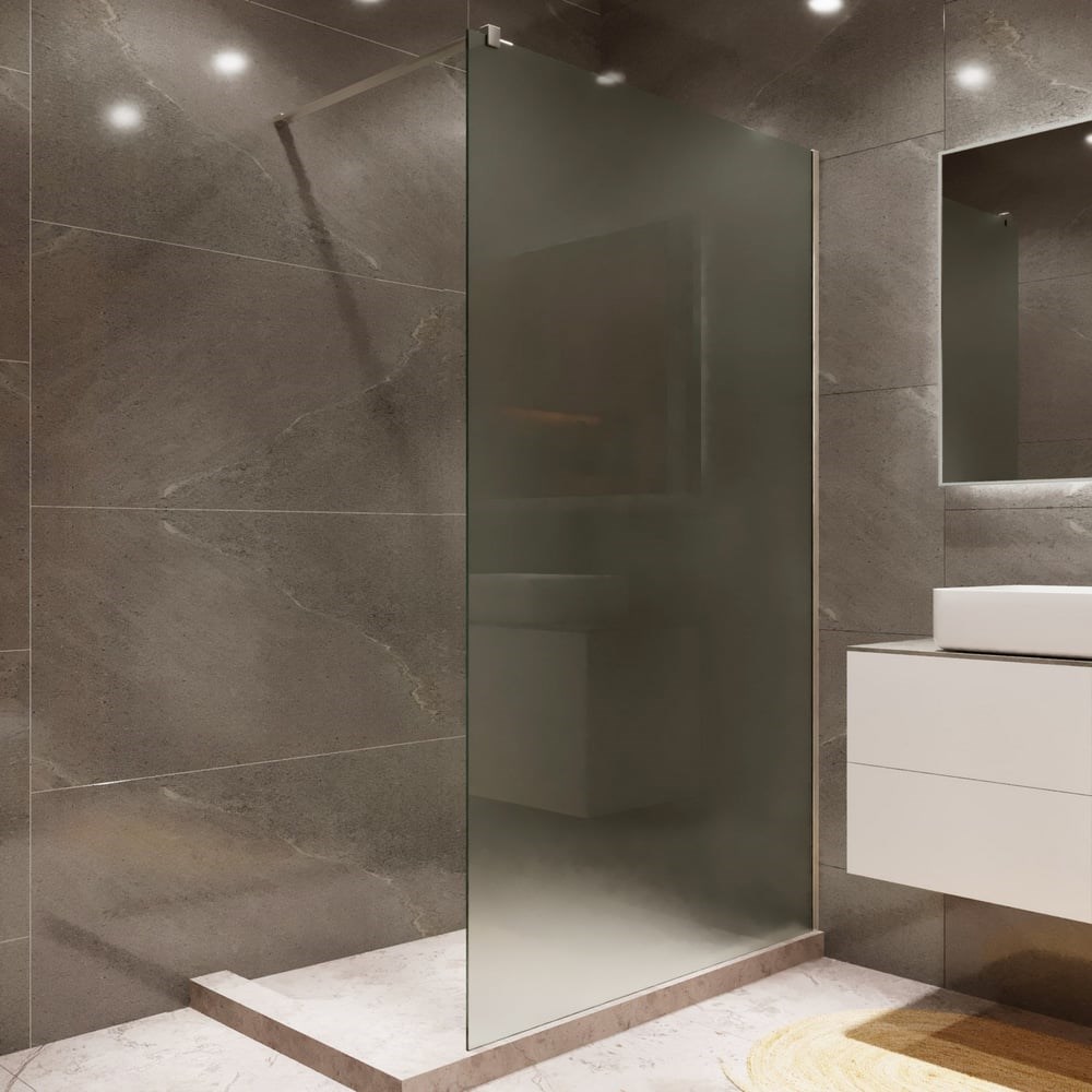 Стационарное стеклянное душевое ограждение. Закаленное матовое стекло толщиной 8 мм.Профиль из анодированного алюминия, окрашенный по технологии матового напыления. Защитное покрытие EasyClean помогает поддерживать поверхность стекла в чистоте, чтобы капли воды не оставались на поверхности. Конструкция перегородки выполнена из анодированного жаропрочного алюминия.Снаружи профиль покрыт оксидным слоем, предотвращающим возникновение коррозии. Исключительная устойчивость к царапинам, отсутствие риска выцветания или запыления.
