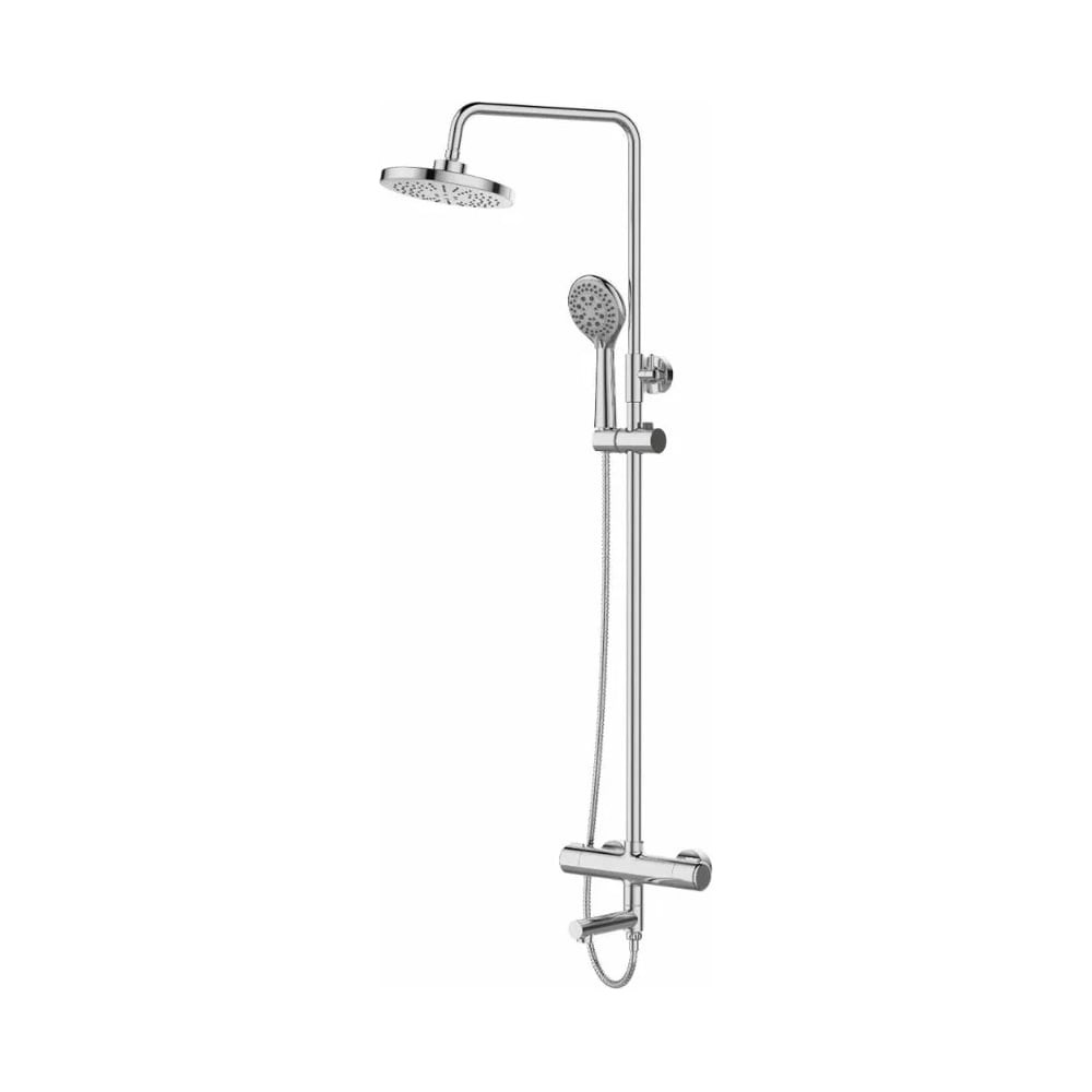 Душевая система Orange Thermo: термостат с поворотным изливом 195 мм (управление осуществляется с помощью двух стильных ручек: левая - регулирует напор воды, правая - управляет температурой, создавая идеальные условия для принятия водных процедур); телескопическая штанга 865-1250 мм; двухрежимный верхний душ (d 225 мм) с регулировкой угла наклона и силиконовыми форсунками (защита от известкового налета); ручной душ d 100 мм (5 режимов) с регулируемым по высоте и углу наклона держателем на штанге; шланг 1500 мм в металлической оплетке, с защитой от перекручивая. Цвет глянцевый хром.