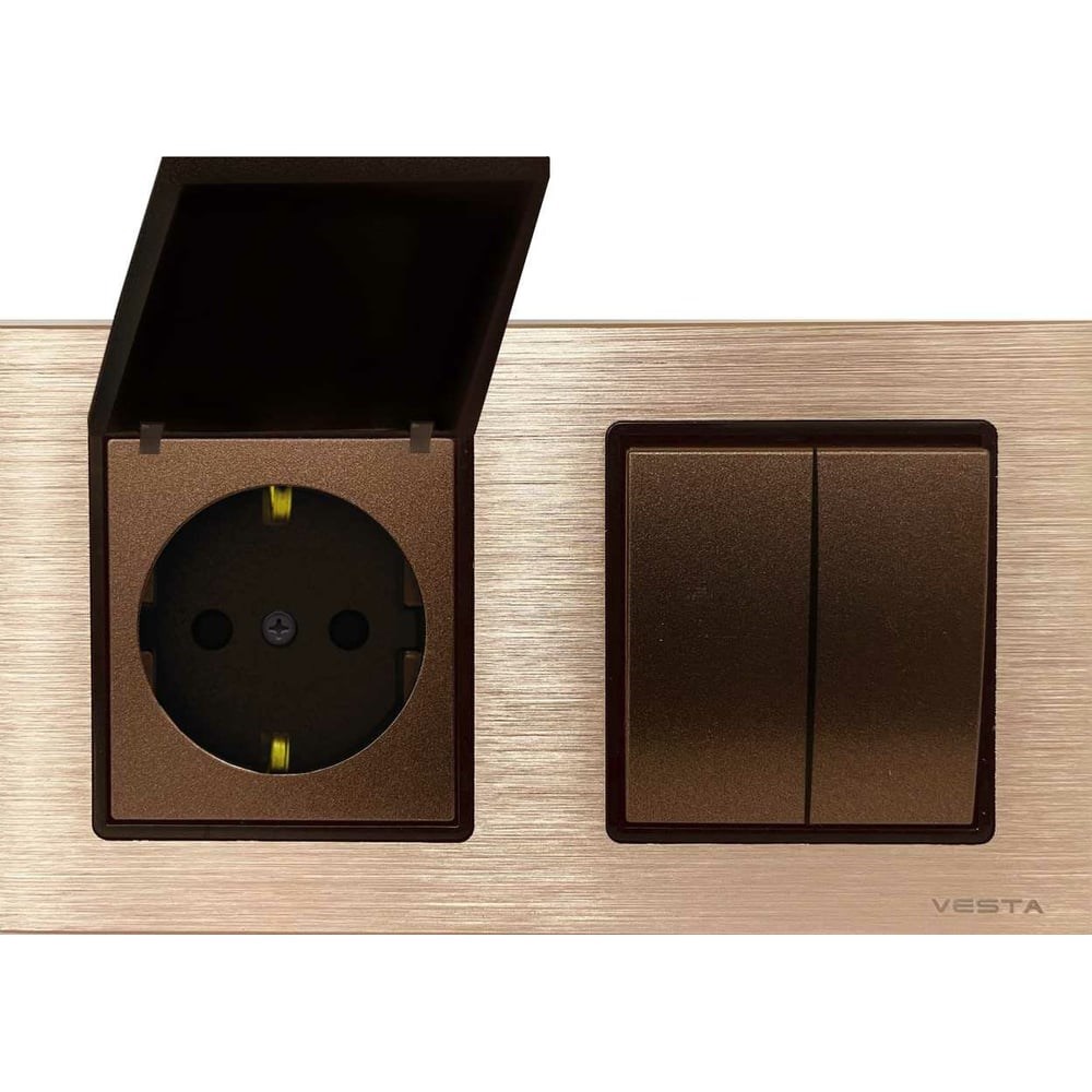 2-клавишный выключатель + розетка с заземлением с крышкой Metronex Electric Комплект-2, Эксклюзивный Шампань FRM050208BSH в рамке из чистого алюминия цвета шампань. Механизмы можно вынуть из рамки и поменять порядок как самих розеток и выключателей, так и изменить их на горизонтальное, либо вертикальное расположение. Контакты механизмов изготовлены из чистой меди с серебряным покрытием, что гарантированно защищает от залипания и образования дуги, а в сочетании с абсолютно негорючим, термостойким пластиком последнего поколения, защитит дом от одной из частых причин возгорания в бытовых помещениях. Гарантия на все изделия 5 лет! Блок выключатель + розетка с заземлением с крышкой. Идеален для установки на кухне, в ванных комнатах, на уровнях близких к полу. Крышка герметично и надёжно защищает механизм от влаги и загрязнений. Для установки блока необходимо 2 стандартных круглых подрозетника.
